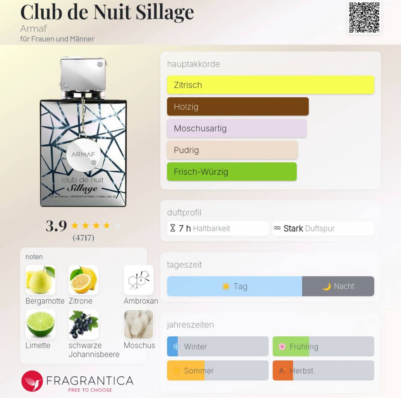 «کلاب د نویت سیاژ» در سال 2020 معرفی شد؛ عطری جذاب که بازخوردهای مثبت فراوانی را برای شما به همراه خواهد داشت. نتهای ترنج، مشک، بهارنارنج، چای سبز و چوب صندل جایگاه برجستهای در این عطر دارند. این عطر بسیار آروماتیک برای اوقات بهاری و تابستانی عالی است، اما واقعا میتوان در همه اوقات سال از آن استفاده کرد. آمیزه «کلاب د نویت سیاژ» با نت لطیف، شفاف و دلنشین مشک شروع میشود و رگههایی از لیموترش هم در نتهای آغازین به جذابیتهایش اضافه میکنند. «کلاب د نویت سیاژ» ژرفا و عمق خاص خودش را دارد.