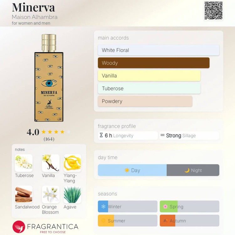 عطری زنانه و مردانه و خاص با رایحه ی خنک و شیرین است، در گروه بویایی چوبی، مشک و گل قرار دارد و مشابه و نمونه شرکتی ادکلن معروف ممو مارفا Memo Marfa می باشد. عطر ادکلن ممو مارفا یا مینروا زنانه و مردانه از محبوب ترین عطر های لوکس برند الحمبرا است که با رایحه بسیار هنرمندانه ای را به شما ارائه می کند. عطر مینروا یا ممو مارفا به چشم گل مریم معروف است و برای استفاده مشترک خانم ها و آقایان طراحی شده است.
