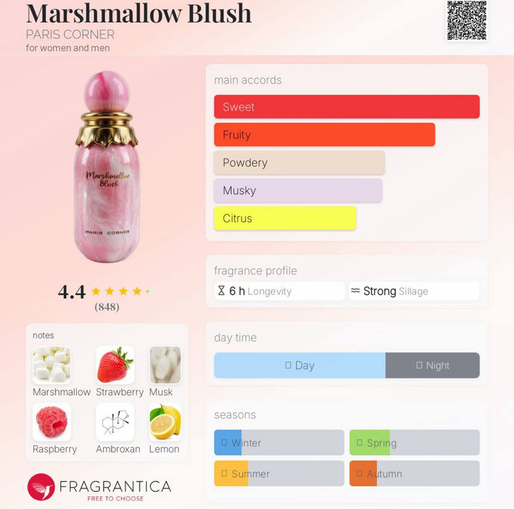 ادکلن پاریس کرنر مدل مارشمالو بلاش رایحه کایالی یام بوجي مارشمالو 81 در سال 2025 به بازار عرضه شد. نتهای اولیه آن توت فرنگی، تمشک و لیمو هستند؛ نتهای میانی آن آمبروکسان و شکوفه پرتقال؛ و نتهای پایه آن مارشمالو و مشک هستند. عطر Marshmallow Blush از برند پاریس کورنر، عطری زنانه و جذاب است
